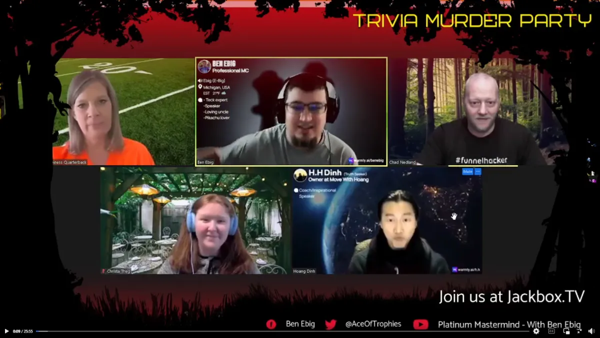 Many of the individuals who would guest as interviews on My Cool Friends would come on to my game show, Trivia murder party. This was a technological nightmare to put up, but I did it anyway. I would use software to put a PS5 screen onto my computer screen, then invite all of my guests to a Zoom call where we would remotely play the game and live stream it. If a guest won, they were encouraged to give away a prize for the next week's winner, so it encouraged both giving and receiving.